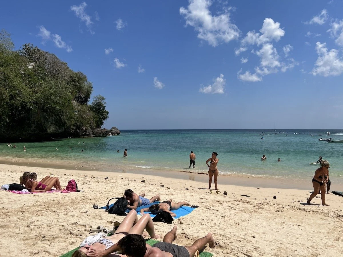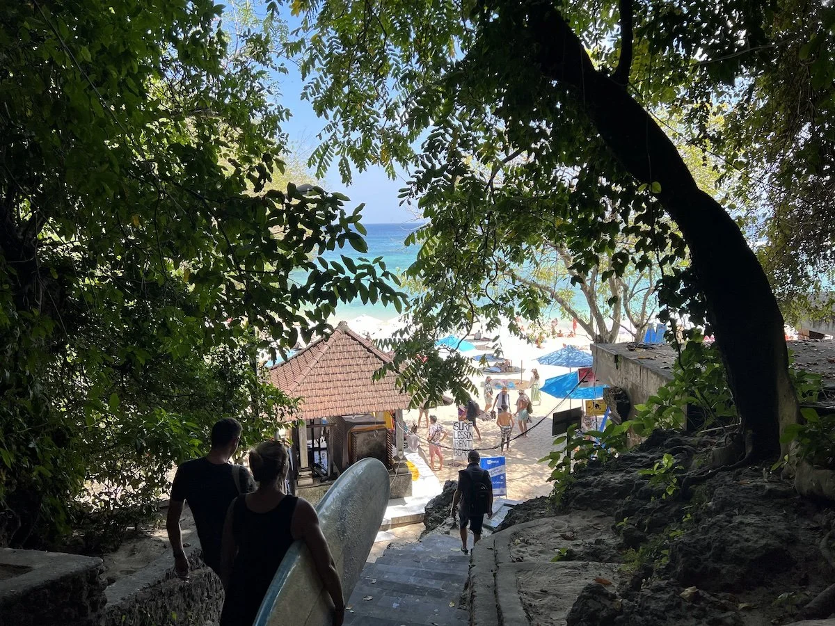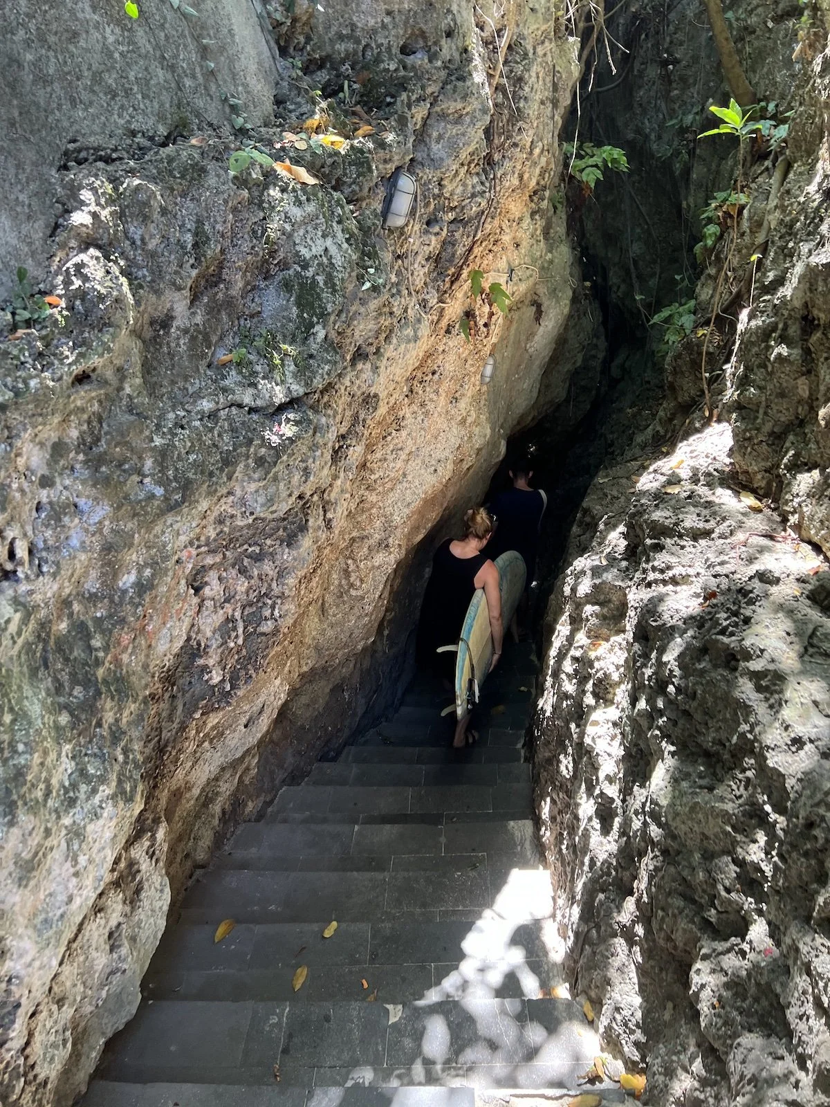 Though I’m staying on a cliff, the beach is just a 20-minute drive away. I’d set my sights on Padang Padang long before actually booking anything for this trip and yesterday, I took a Grab car (one of the Ubers of Bali) to the drop-off point where a trio of tiny monkeys greeted us beachgoers before we ducked down the cave-enclosed wooden staircase. I was too self-conscious to stop for pics, but yes, they were tiny, mischievous, and cute.