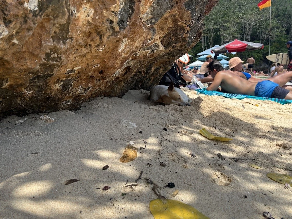 The cave path gave way to an unreal view of turquoise-blue water and white sand, and an already tight cluster of rented umbrellas. I claimed one of the few naturally shady spots just in front of a large boulder that two roving beach dogs were already nestled against and watched as the surfers tossed their boards into the crystal clear water and paddled out past the large rocks marking the shore.