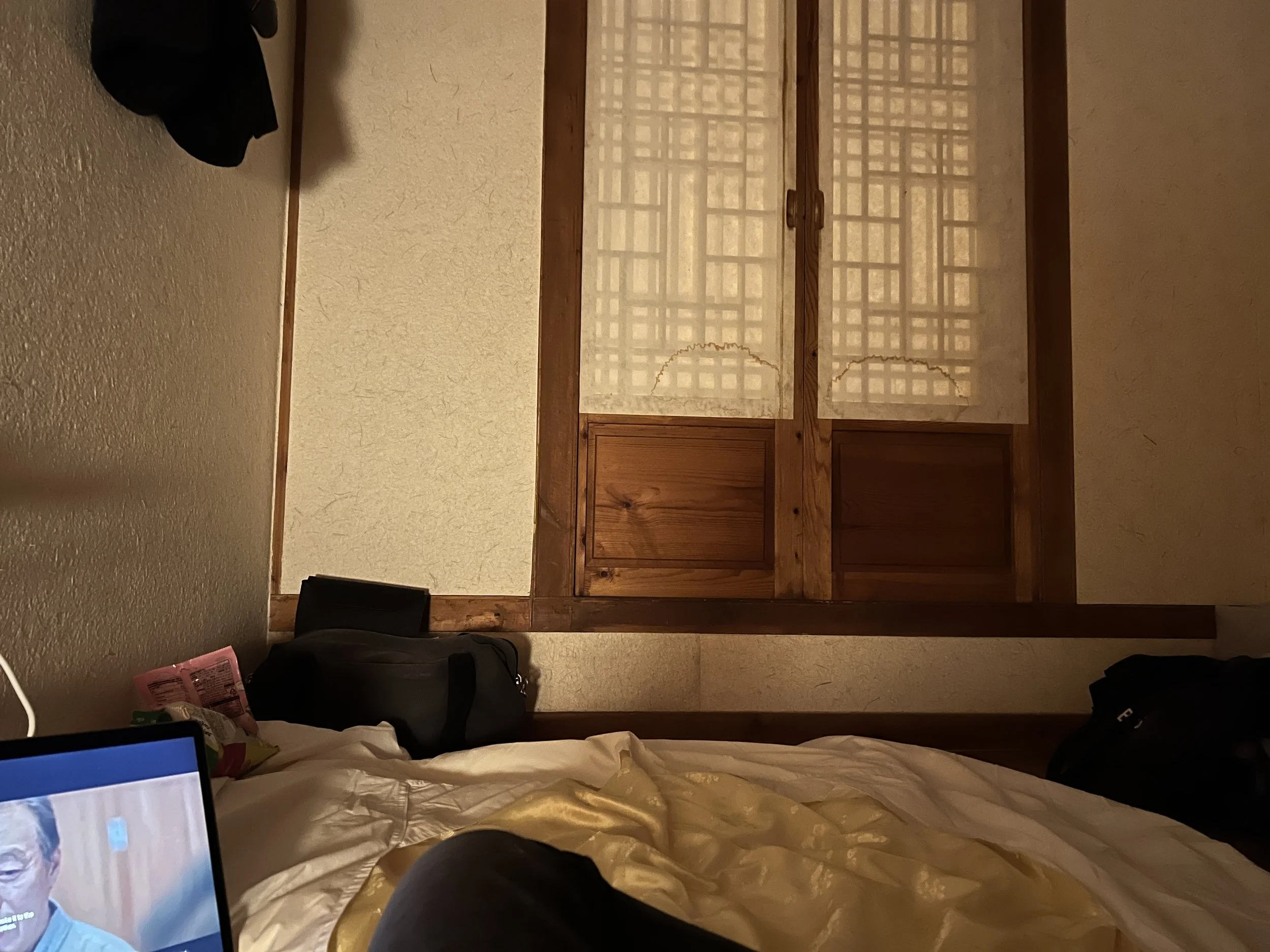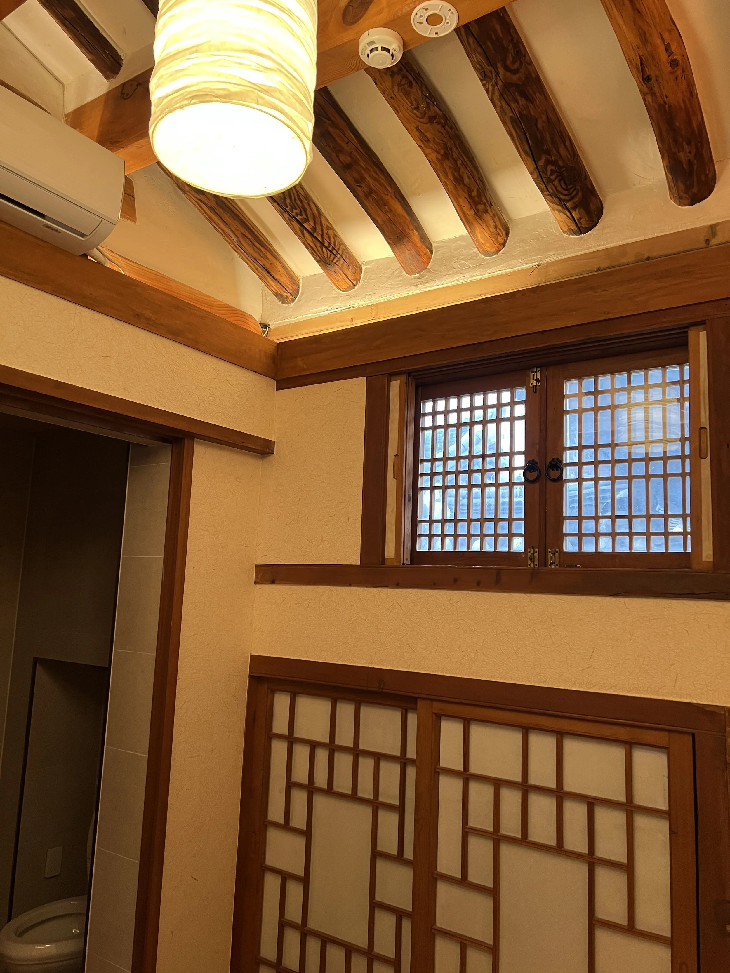 By the time I reached the express train from Incheon to Seoul Station, I was relieved—this part, I knew how to do. By the time I arrived at the central station, I was recharged enough to lug my bags onto the subway to Anguk, then trudge the 10 minutes or so through the charming old Hanok Village to the Airbnb guesthouse I’d booked for the night. My room, Cozy 1, was as stated—a tiny traditional room with nothing in it but a folded up futon, comforter, and pillows piled in one corner and a small Noguchi-style lamp. In the bathroom, a deep wooden Hinoki tub sat ready for filling and soaking. In my old age, my vacations have become a string of luxurious baths.