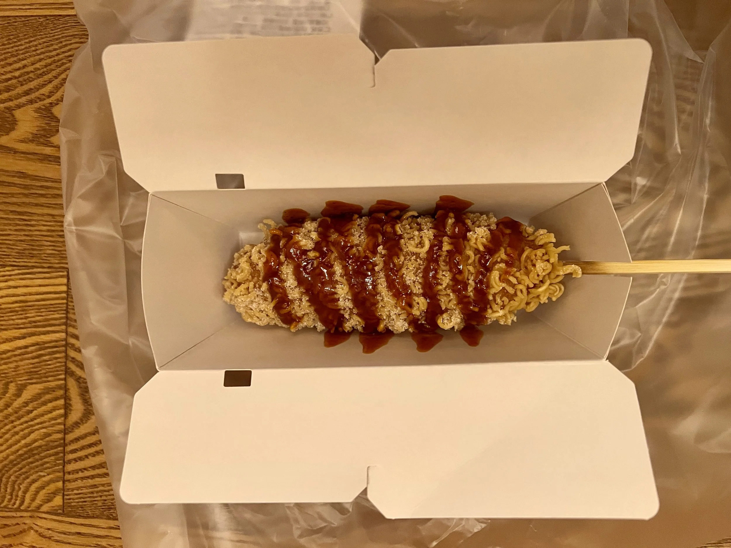 I was actively avoiding restaurants, however. I’d already decided that this night, I would have the one Korean food I didn’t manage to sample last time: the elusive Korean corn dog. Lucky me, there was a shop dedicated to them right on the way back to the hanok, and I could order from a machine; no embarrassing myself in front of an employee necessary. The downside of machines with small images: you may not actually know what you’re getting. What I thought was a regular crunchy Korean corn dog covered in zigzags of ketchup, mustard, and mayo wound up being a half-mozzarella (eep), half-sausage Frankenstein coated in batter, then dipped in what looked like crunched up ramen noodles—all of which had been deep fried and rolled in sugar (!) before being drizzled with a delicious but absurdly spicy sauce that left my lips tingling long after I’d finished because yes. I ate the cheese. After one glass of wine (mistake), I was in a “destroy myself” kind of a mood.