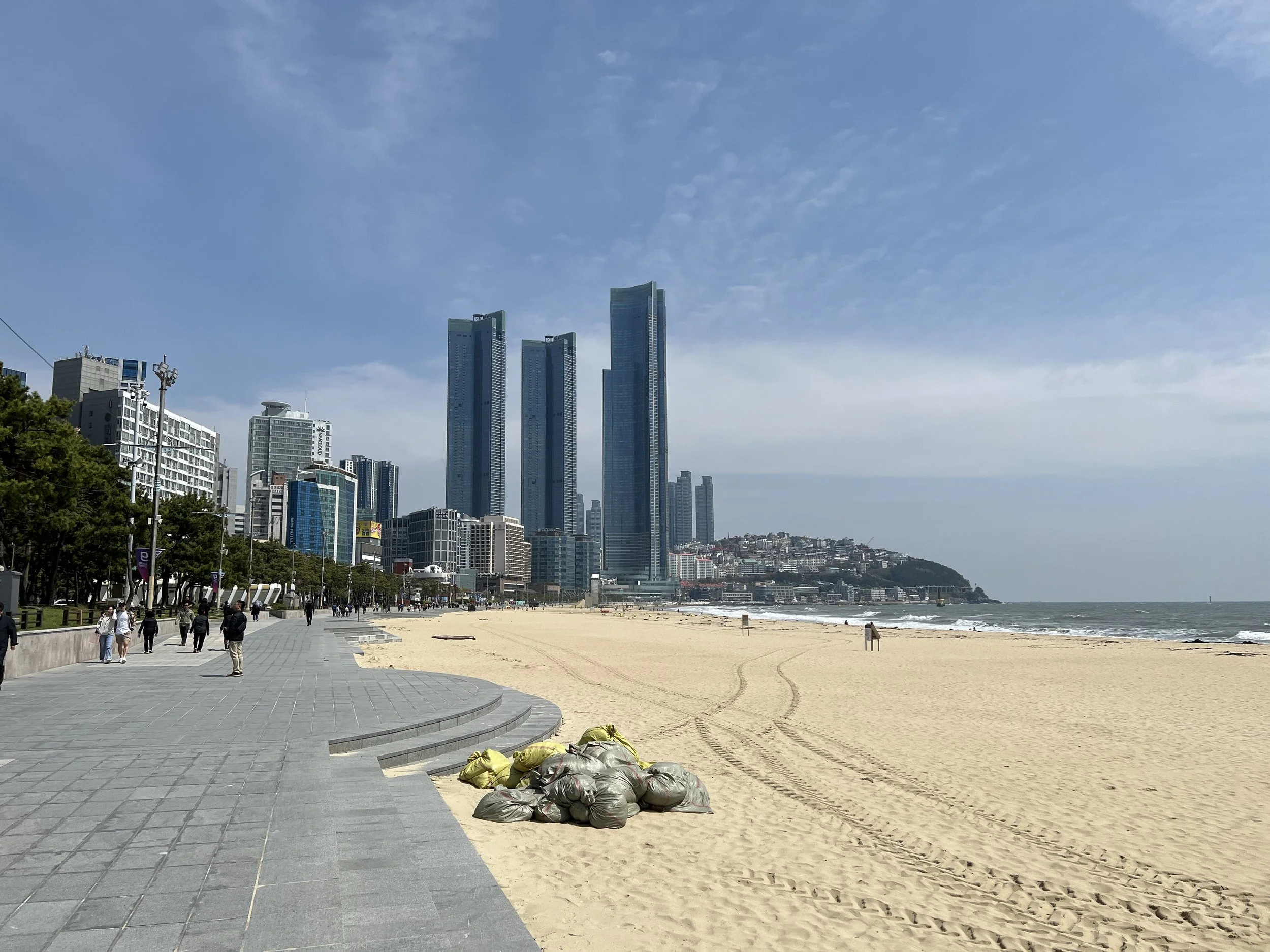 From the museum, I walked back toward the hotel, then through Marine City, toward Haeundae Beach, one of the main draws of Busan, even though it’s not yet swimming weather. I walked the length of the boardwalk, then bought a roll of gimbap—only $3 for one of the most delicious meals so far. I ate it on the steps facing the ocean, pausing between pieces to re-wrap it to shield it from the flying sand.