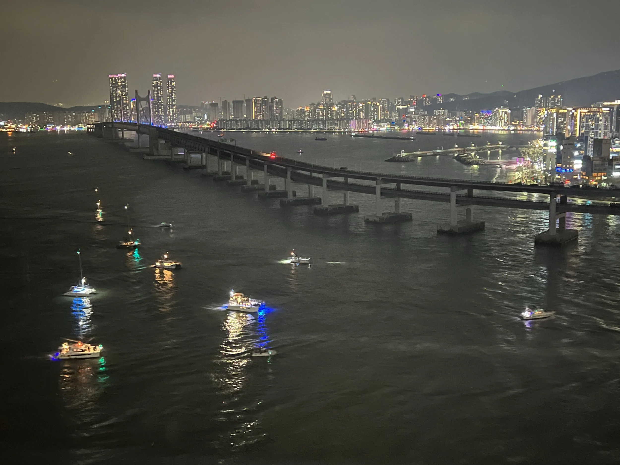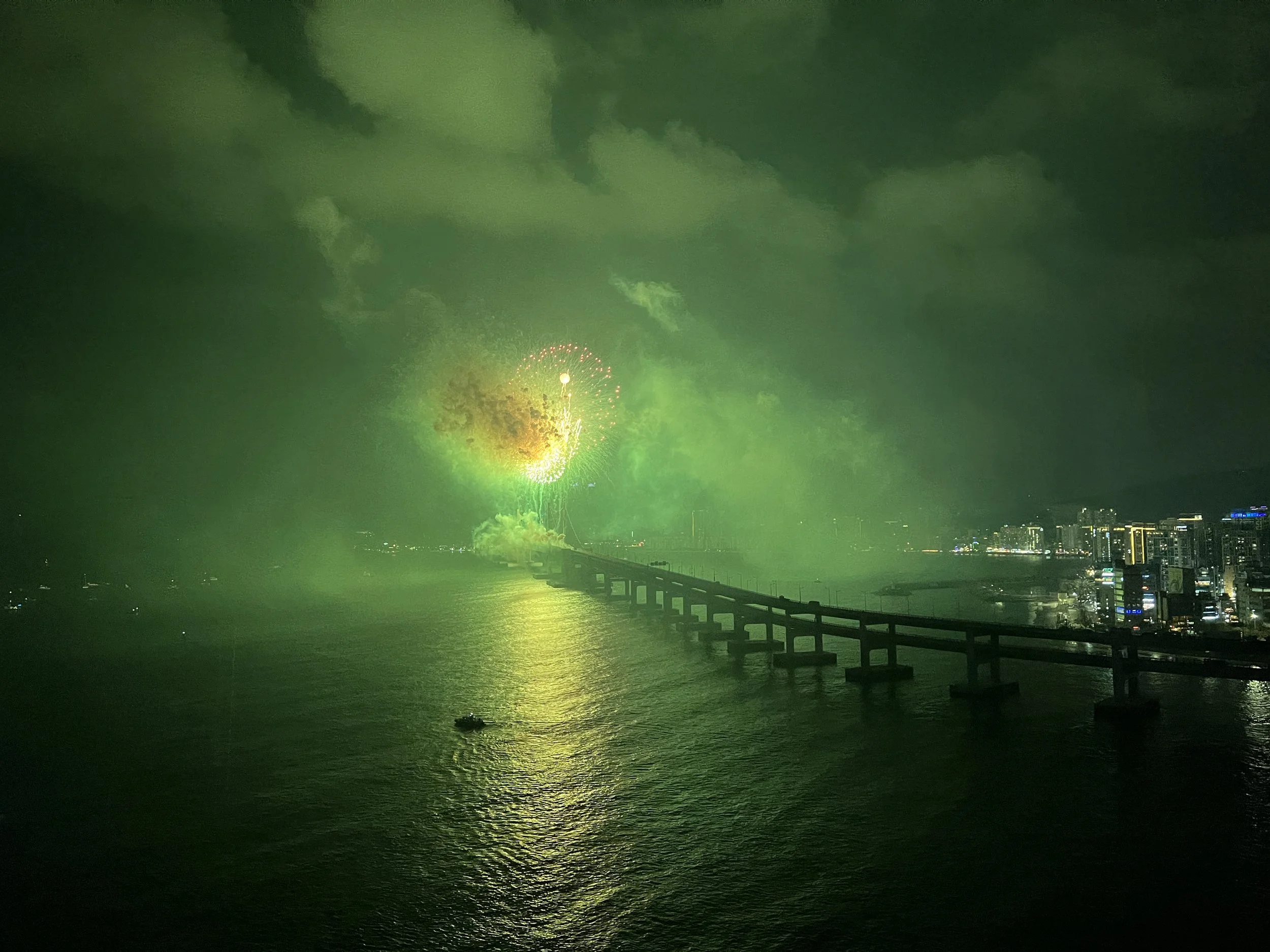 Come nightfall, I watched the impressive, nearly hour-long fireworks show—part of Busan’s bid for the 2030 World Expo—erupt over the bridge from the comfort of my hotel room while slurping down instant noodles. When the show ended with a humble final plume, I gazed out at the many private boats that had gathered in the dark harbor as they slowly drifted their way home.