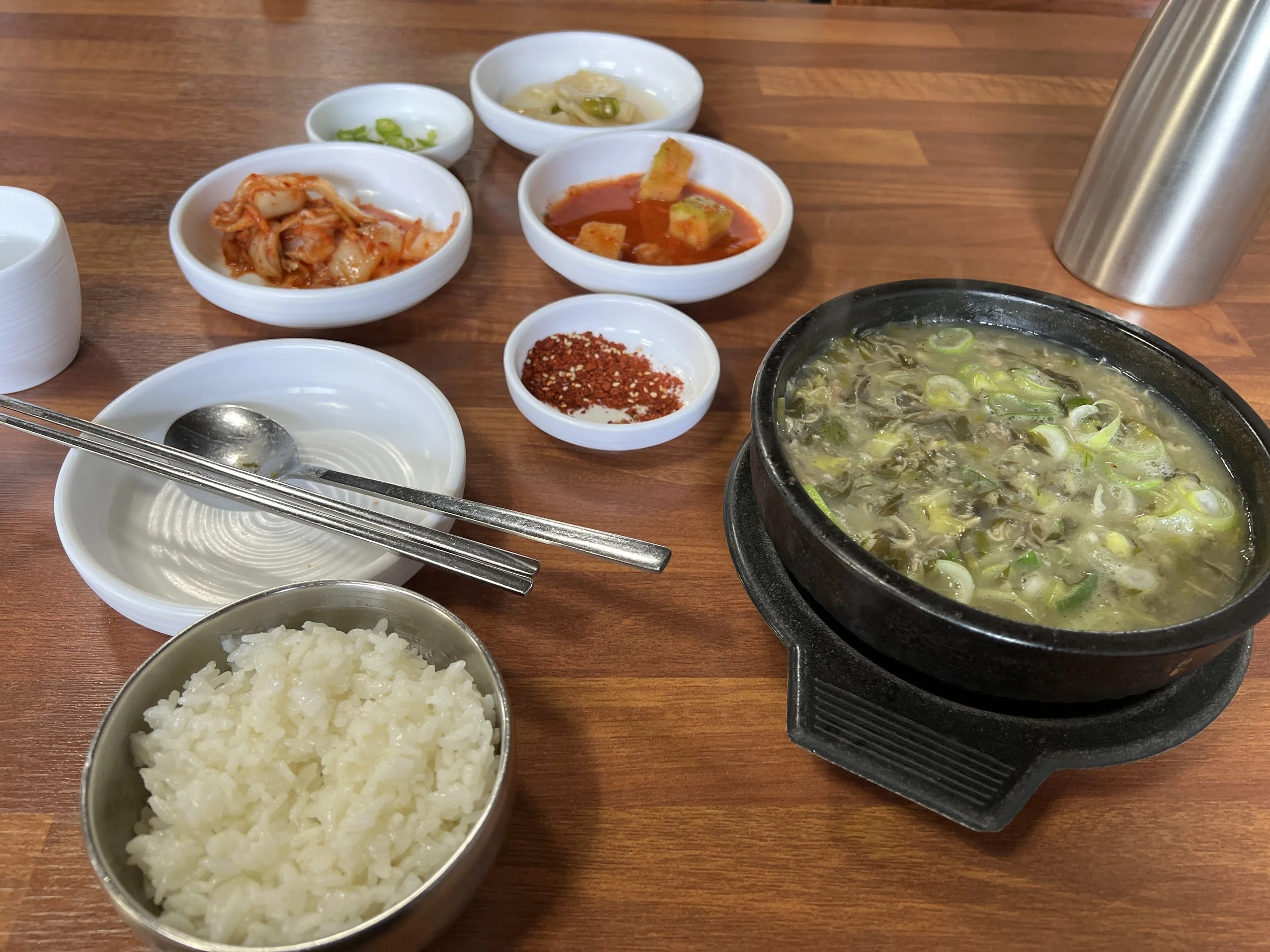 I had no clear plan for the rest of the day, so I took another taxi to Jungmun, the small town just north of The Seaes and walked until I found a restaurant that had good reviews. Of course, it also had a massive line. So instead, I went to the copycat noodle restaurant next door, sat down right away, and ordered 몸국, which Google Translate told me is “body soup” but a subsequent search revealed something less sinister: pork and seaweed soup, a Jeju specialty.