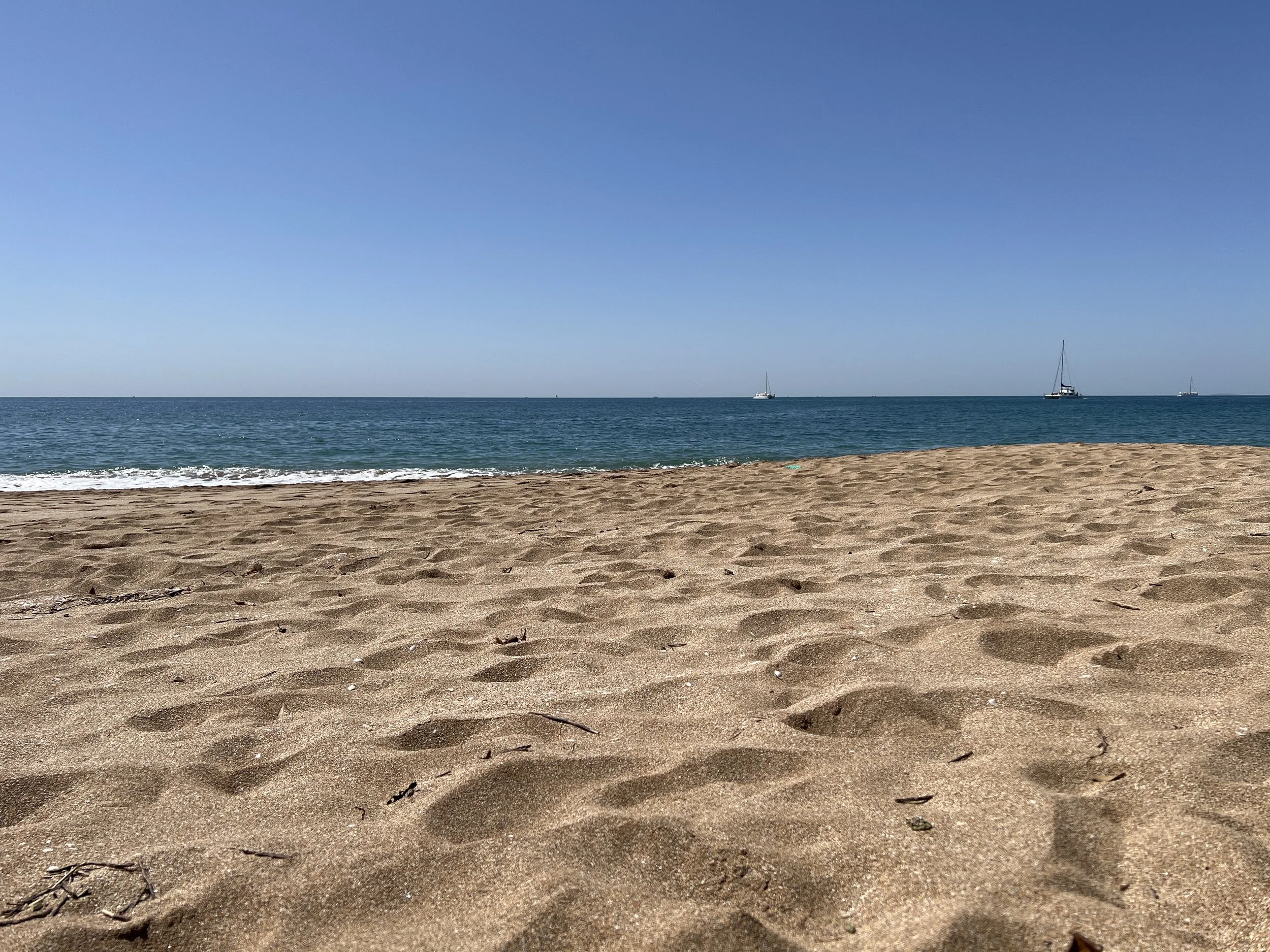 Today, following another good but more meager breakfast and writing session, I walked immediately to the beach. The previous two days had been overcast and chilly with a persistent wind but today, Easter Sunday, was gorgeous and sunny—no wind, no clouds. I sat on the beach and read my second book (Trust by Hernan Diaz), occasionally looking up to see a baby boy trying to escape into the sea only to be snatched up at the last minute by his young father, or to see a slightly older boy gingerly dipping his toes into the surf. His parents sat up in a gazebo overlooking the beach, but the mother called down to her son in Korean.