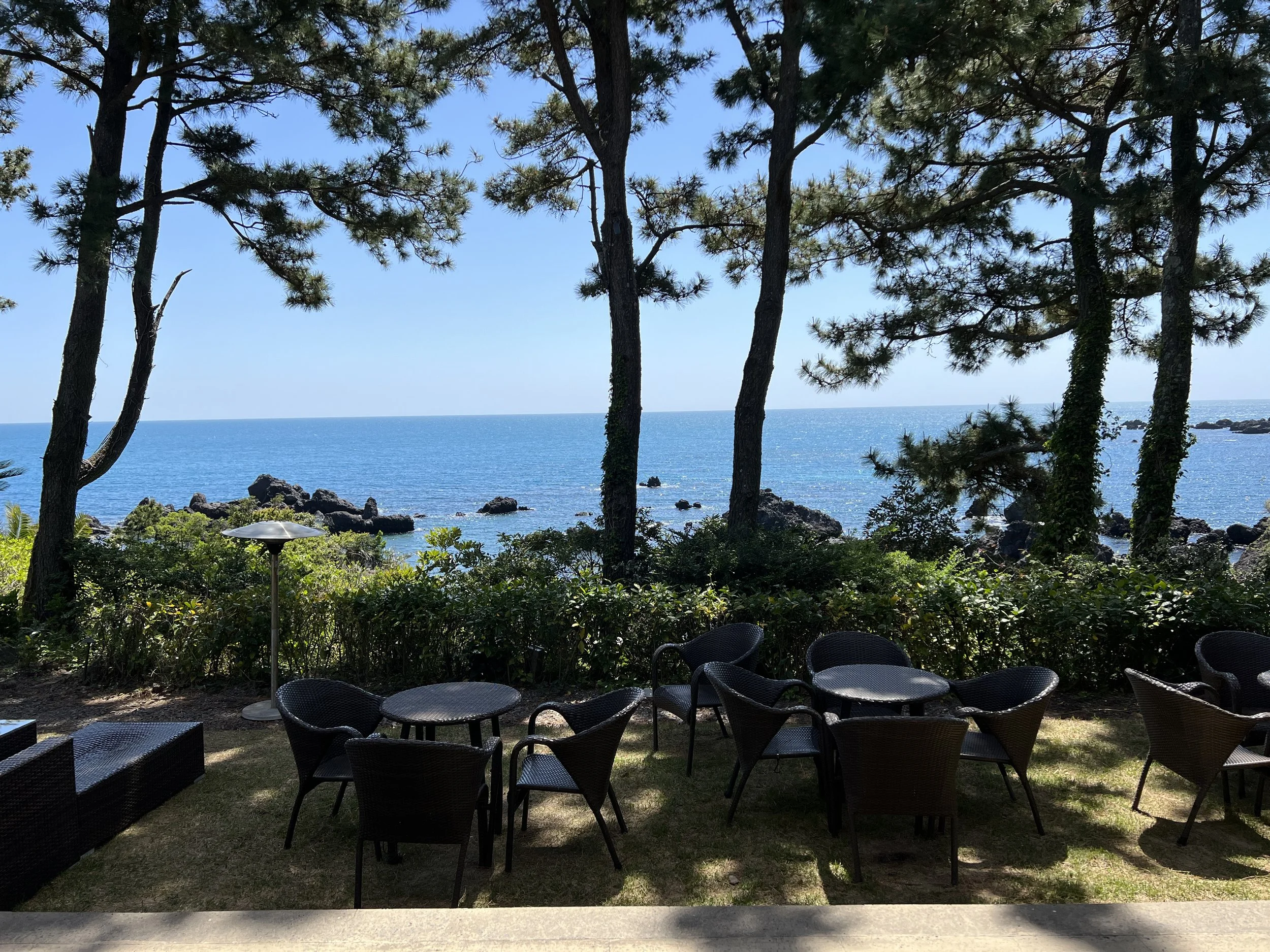 Saturday brought hotel breakfast with a solid spread and an ocean view, followed by a fairly tenuous bus journey to Bonte Museum, another Tadao Ando gem—he designed both the Benesse and Chichu Museums on Naoshima that’d I’d fallen for back in 2016 and it felt like fate that this third space was within an hour of my Jeju hotel, though unplanned by me. The first bus was easy. It showed up right on time, and after 20 minutes or so, off I hopped. The second, though, had no ETA. I waited. And I waited. Finally, Naver Maps gave me an estimate: 48 minutes away. Nope! I used Kakao Taxi to hail a car and within 10 minutes, I arrived at the museum atop a small hill with views of both the volcanic Mt. Hallasan and the ocean below.