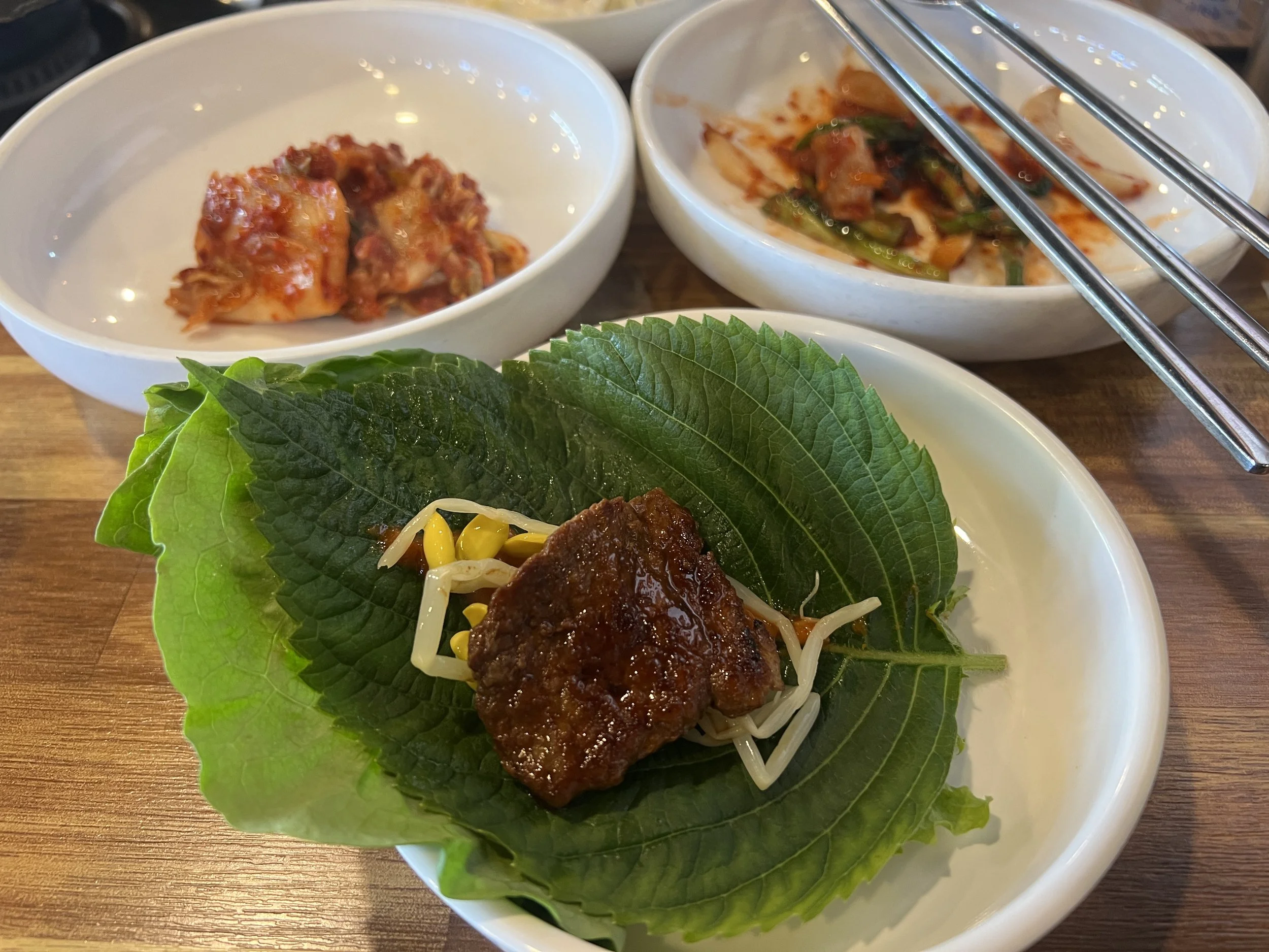 Eventually, though, my stomach protested, so I walked another 45 minutes back to the same area where I’d had lunch the day before and found a barbeque spot that had some people in it despite the odd hour (after 2 p.m. at this point). Jeju is famous for its black pork (funny, given it’s an island surrounded by, ya know, fish)—even my dad managed to hear about it. So in his honor, I had an Easter brunch of black pork Korean barbeque, half of which I grilled myself, then cut with scissors and folded into small bundles of lettuce, perilla leaf, bean sprouts, scallions, and chili paste. So good, I no longer resented the double portion I’d been pressured into ordering.