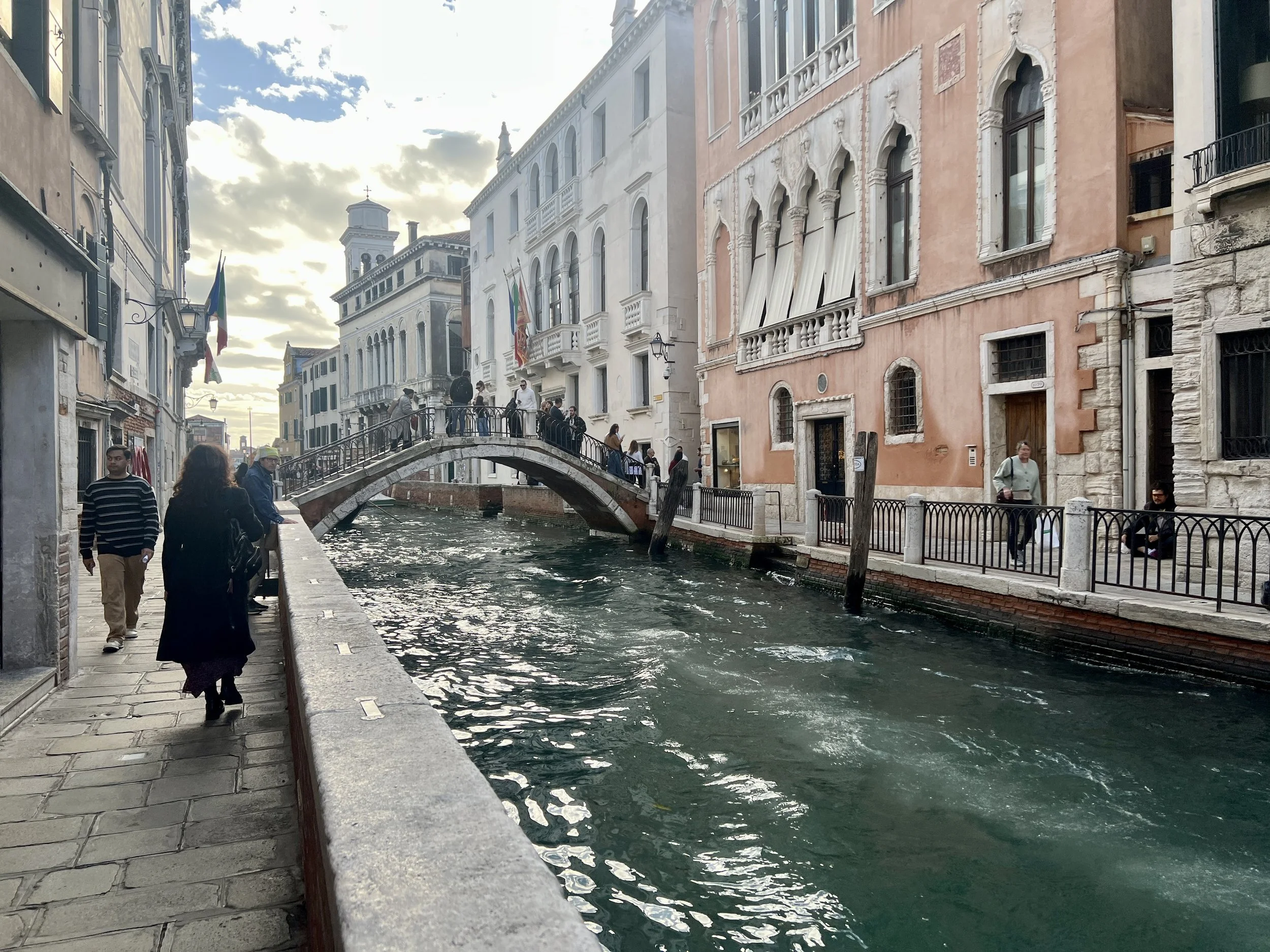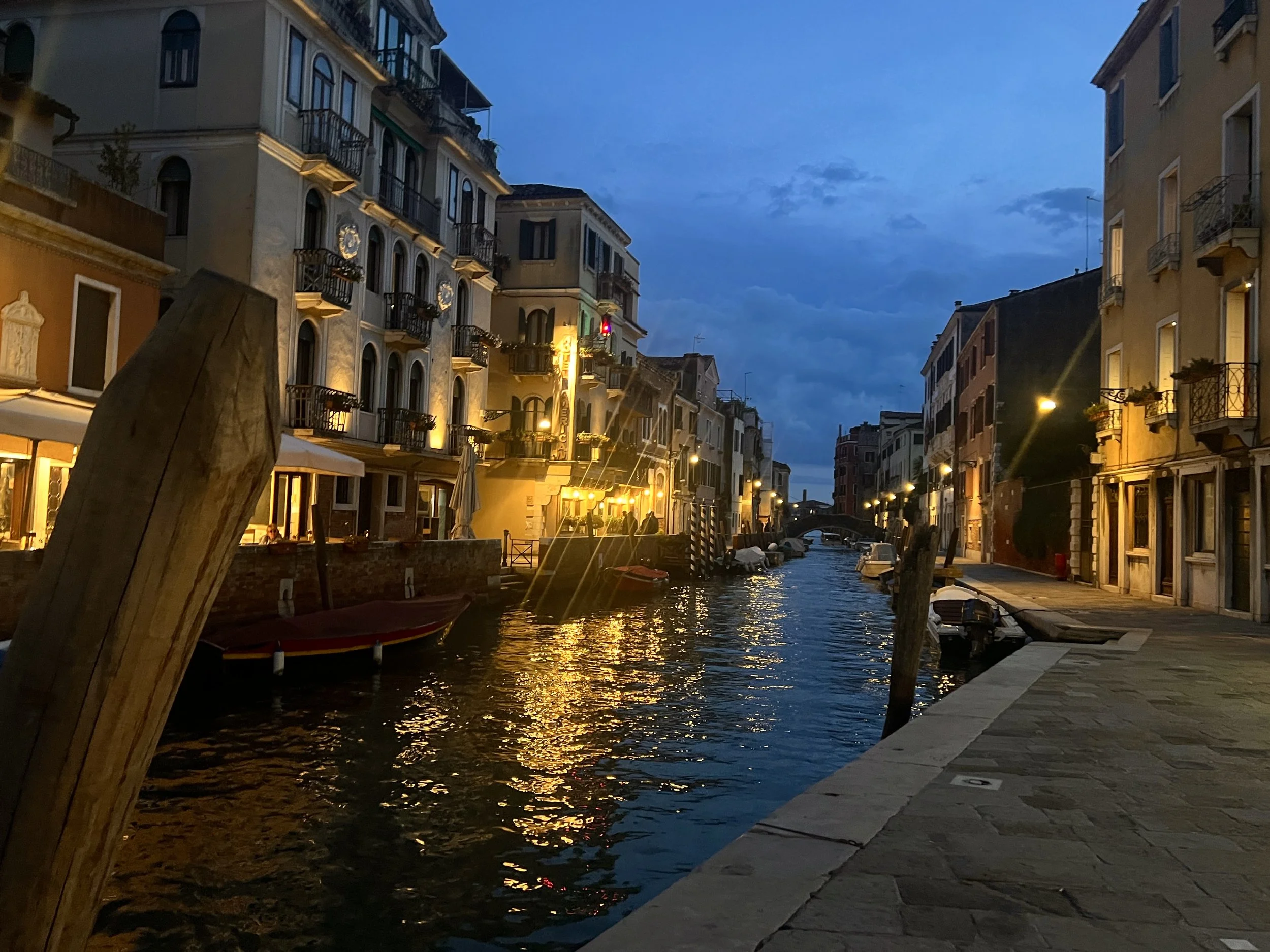 Eventually, I settled in at an outdoor bar where Italians sat sipping radioactive-orange spritzes. I ordered a spritz of my own, and two cicchetti, the Venetian version of tapas. Two slices of baguette, one topped with mustard and mortadella, the other with soppressata. I wrote for an hour or so, just until the sun began to set, then made my way back toward the hotel. Lanterns glowed on the buildings across the dark water, and the sky dimmed to a deep blue. I stood near two Swedish women, in blonde solidarity, and snapped a photo. As I said to a dedicated blog reader, the charm is real.