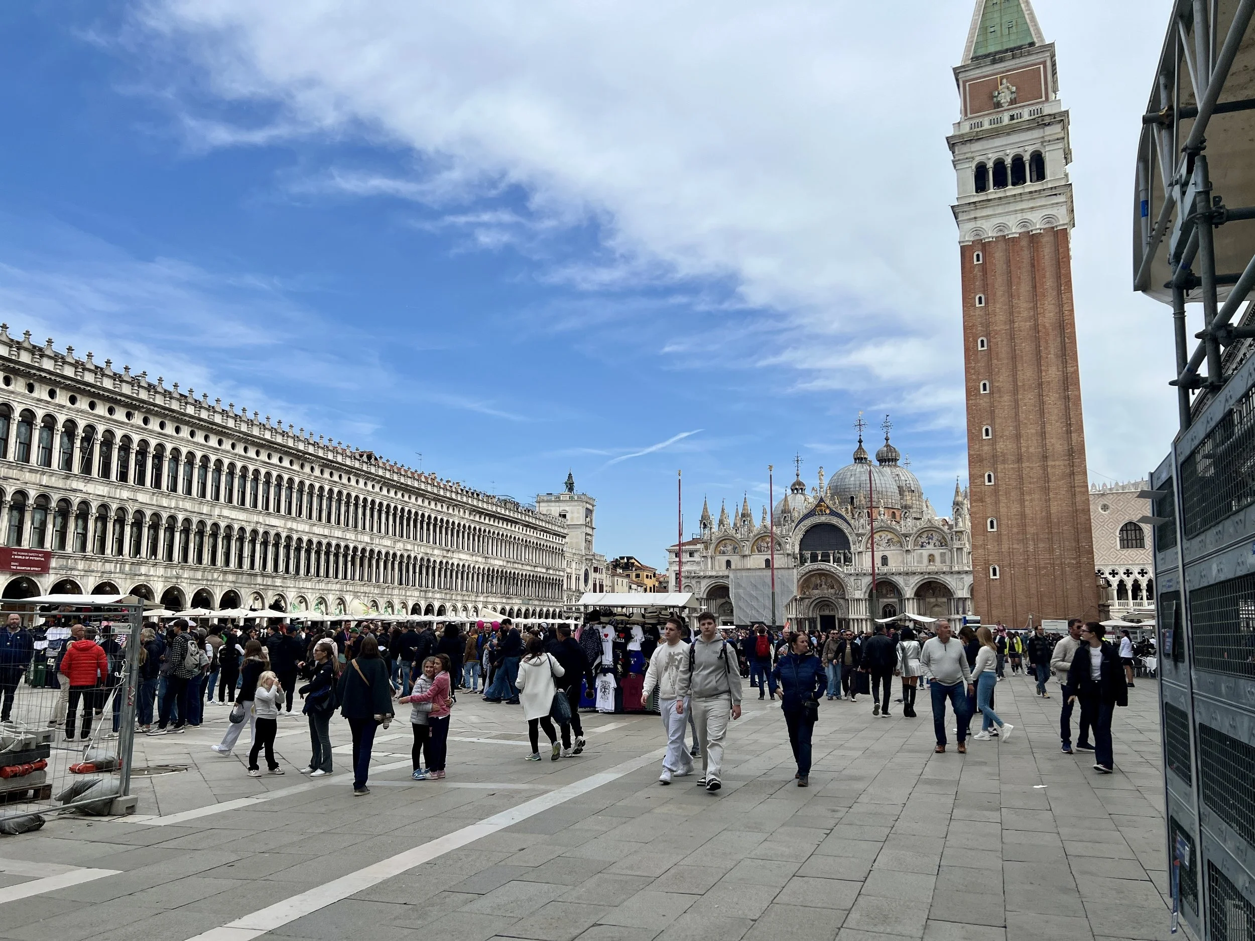 I walked back across the bridge and toward San Marco, wary of the crowds I would encounter in the Times Square of Venice. I followed a pilgrimage of pedestrians headed in the same direction, and eventually, we exited a narrow passage into the wide, open piazzo. I walked along the right side, admiring the velvet and gold rococo of Caffe Florian, where Hemingway once wrote, until I neared the basilica. Crowds of people stood before netted barriers blocking the path to the Doge’s Palace. I was hoping to circumnavigate the palace and carry on to a chapel to see the Tintorettos, but my plan was foiled. Back into the square I went, walking around the barriers to the other side. As I walked, I heard cheers and whistles—the lead marathoner had just arrived. Ethiopian, of course. This explained the barriers.