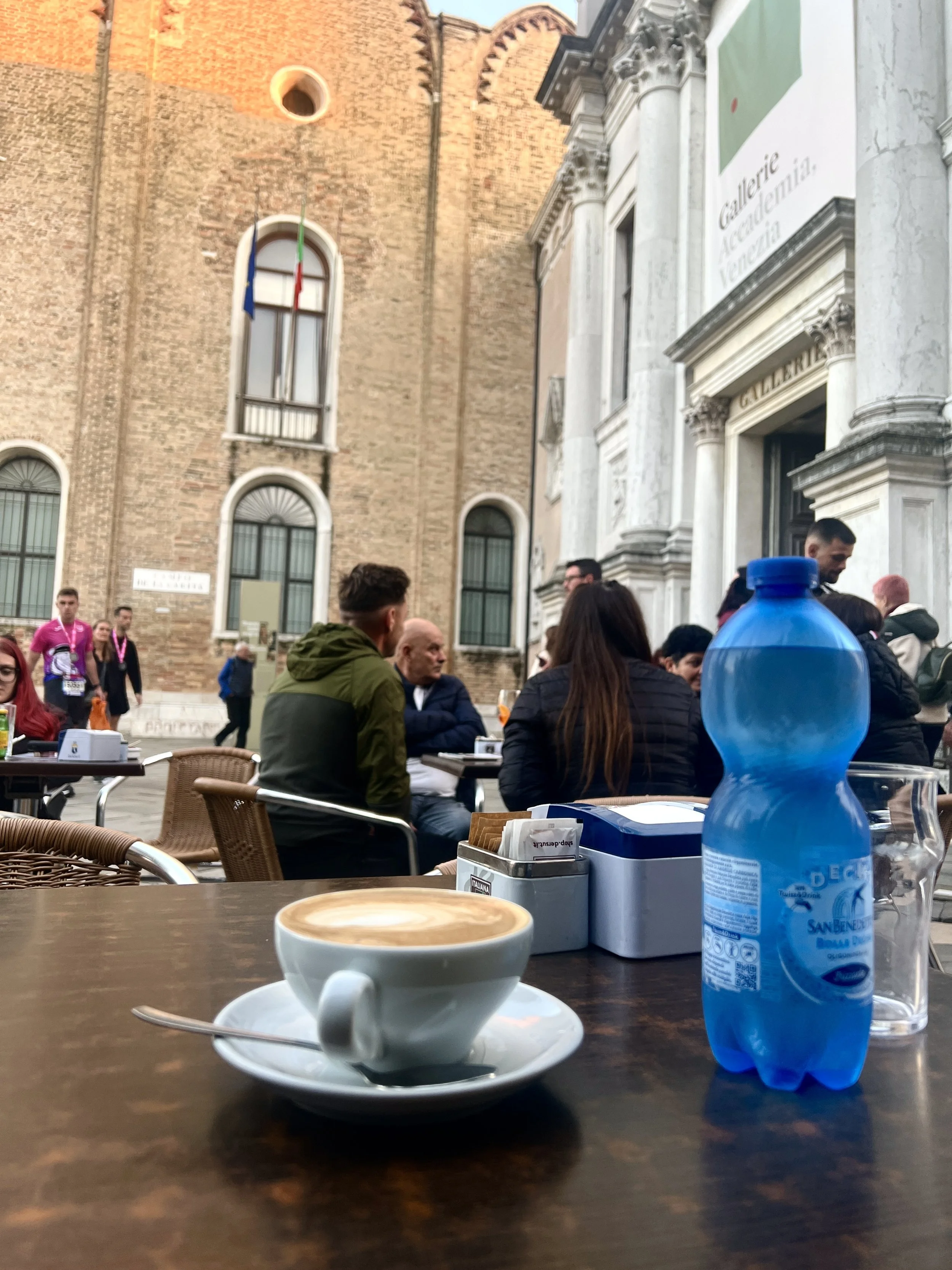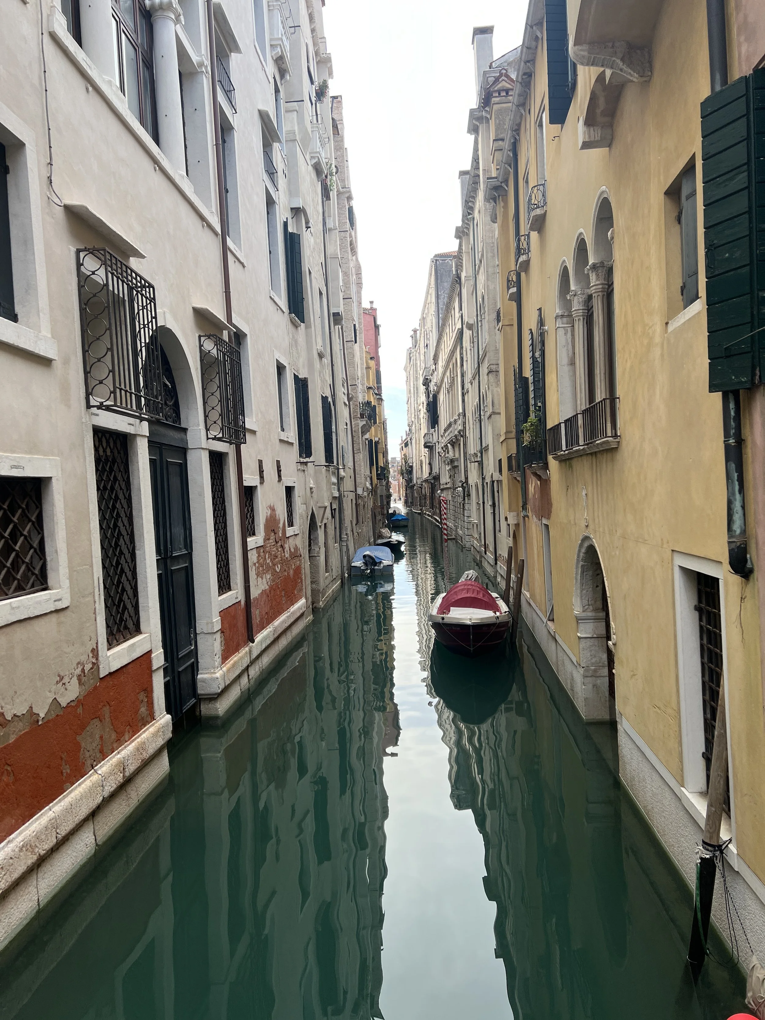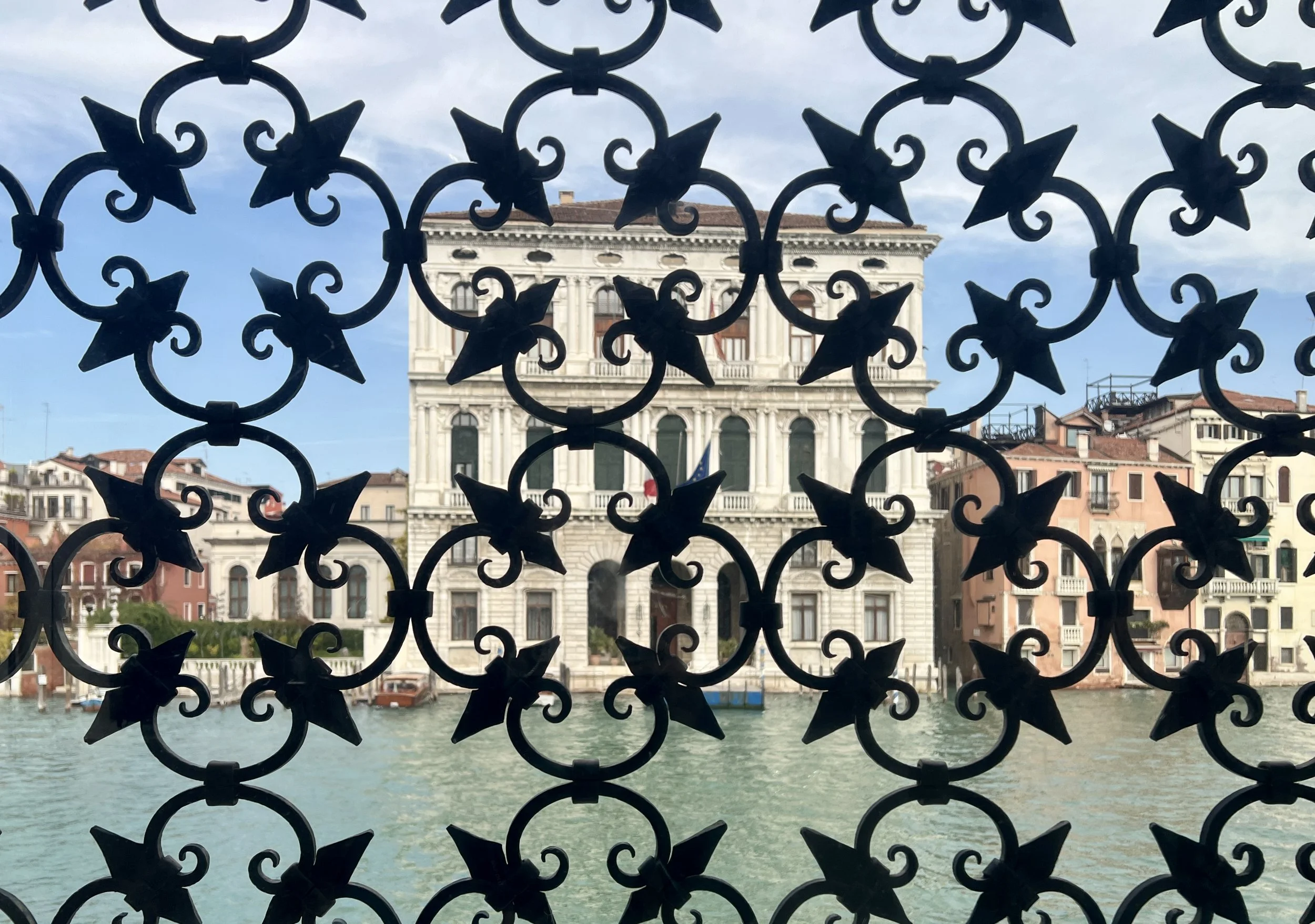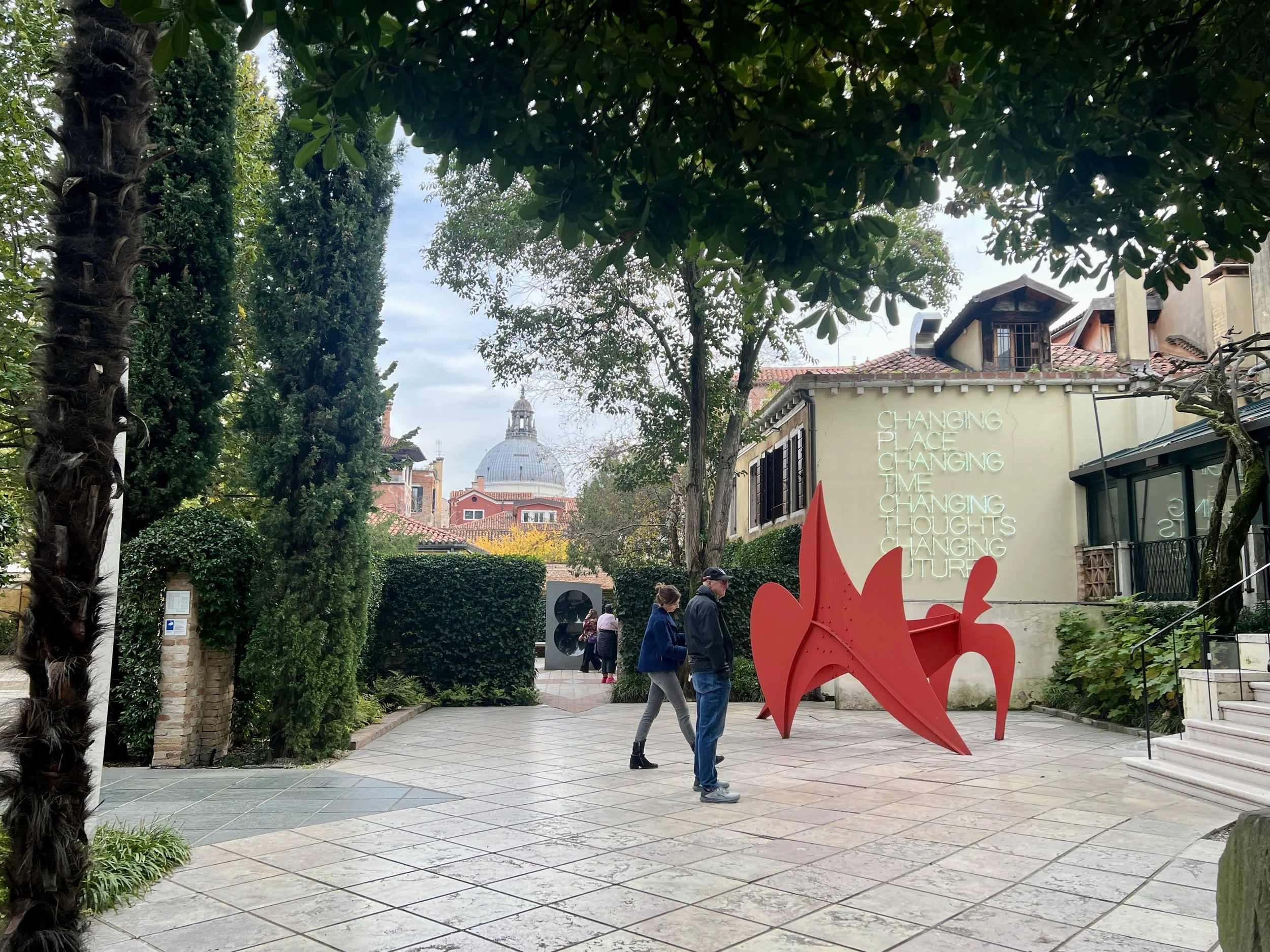 Following hotel breakfast (duh) and a cappuccino at a cafe across the Accademia Bridge, I set off down the street to the Peggy Guggenheim Collection in an old villa backing up to the Grand Canal. Pollock, Picasso, Calder greeted me as I entered the space. As I wove deeper into lower halls, I discovered an immense Agnes Martin grid symbolizing a delicate rose. My audio guide murmured words from Peggy’s journals about her friendships with Kandinsky and Duchamp while I meandered through the small galleries. Outside on the terrace, I watched a family attempt a timed portrait and waited for them to ask me to take their photo, but the request never came. As I left the museum, though, a couple (Indian? Pakistani?) asked me if it was “worth it.” Yes, I said, but I love art.