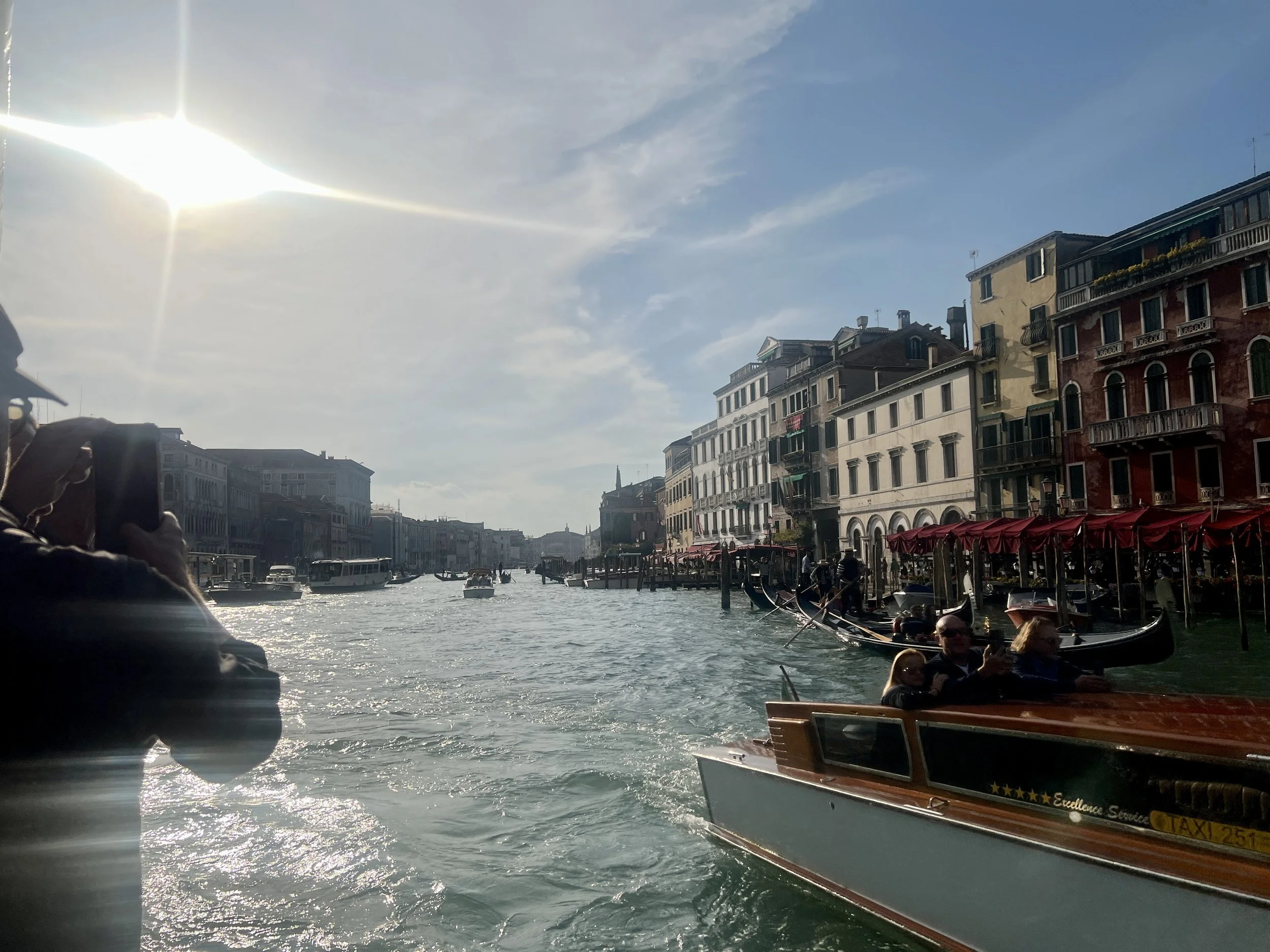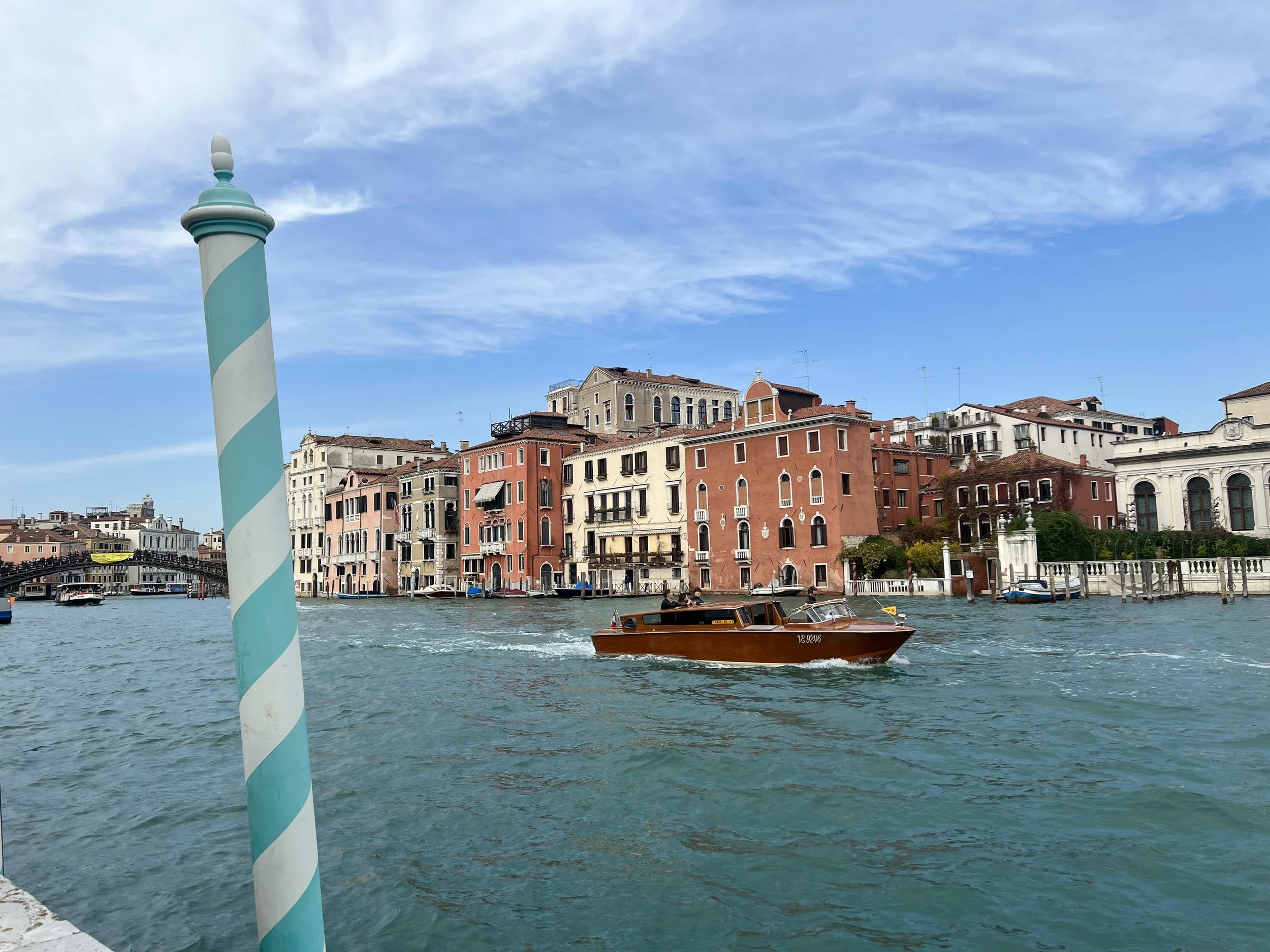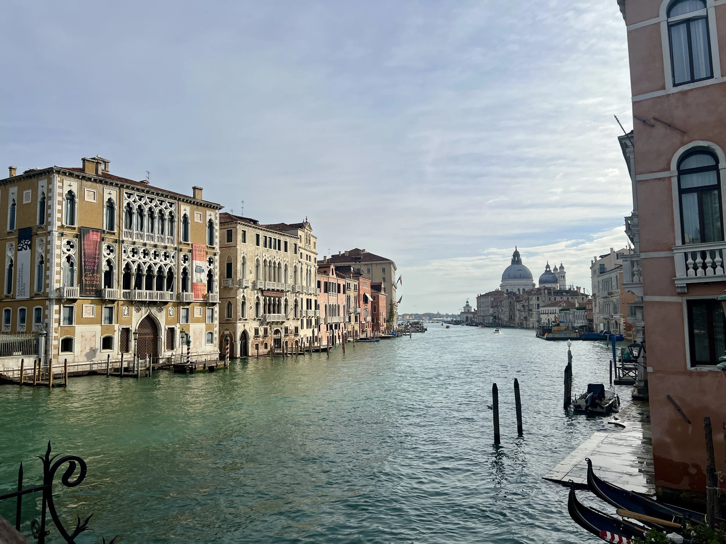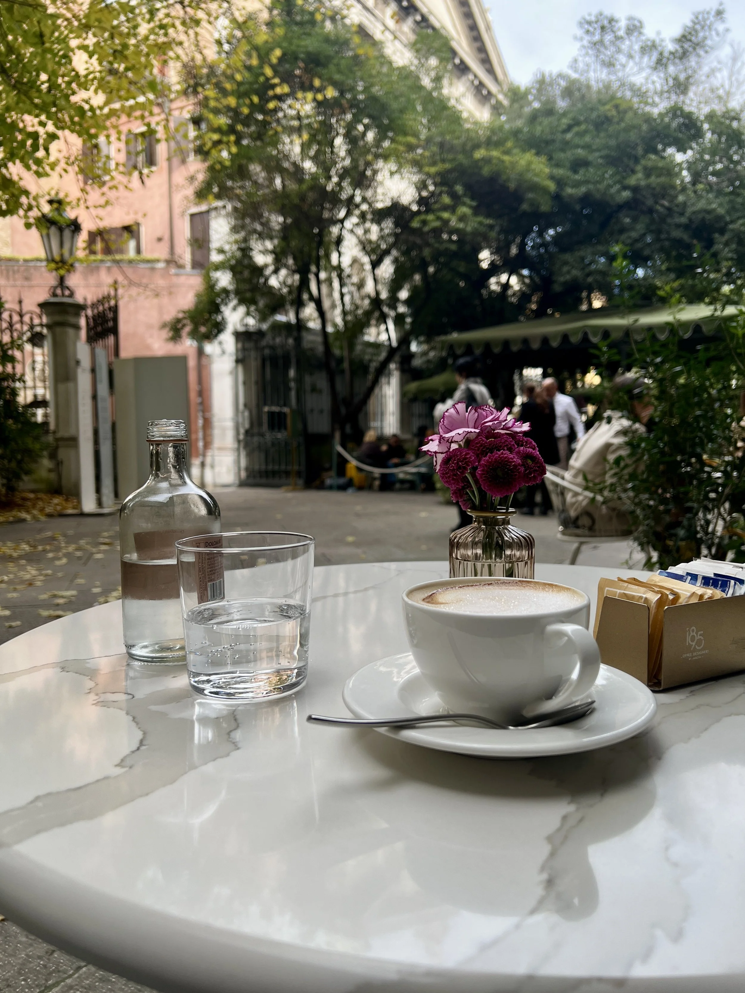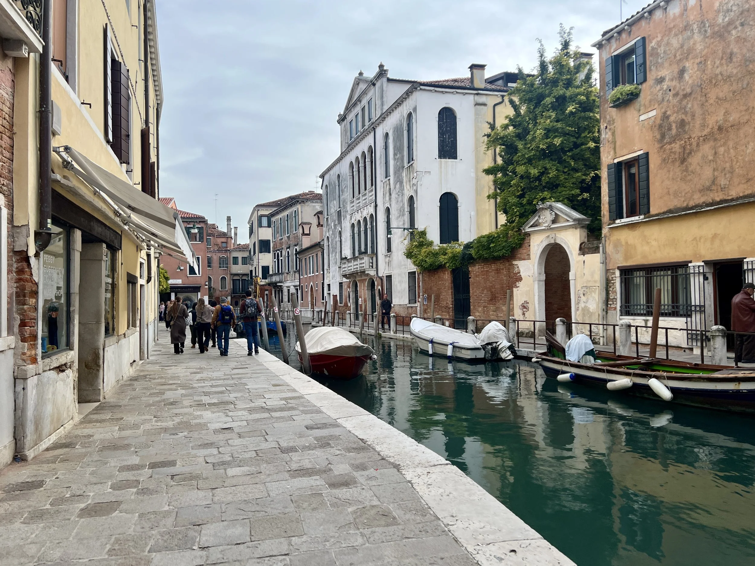 Following hotel breakfast (duh) and a cappuccino at a cafe across the Accademia Bridge, I set off down the street to the Peggy Guggenheim Collection in an old villa backing up to the Grand Canal. Pollock, Picasso, Calder greeted me as I entered the space. As I wove deeper into lower halls, I discovered an immense Agnes Martin grid symbolizing a delicate rose. My audio guide murmured words from Peggy’s journals about her friendships with Kandinsky and Duchamp while I meandered through the small galleries. Outside on the terrace, I watched a family attempt a timed portrait and waited for them to ask me to take their photo, but the request never came. As I left the museum, though, a couple (Indian? Pakistani?) asked me if it was “worth it.” Yes, I said, but I love art.
