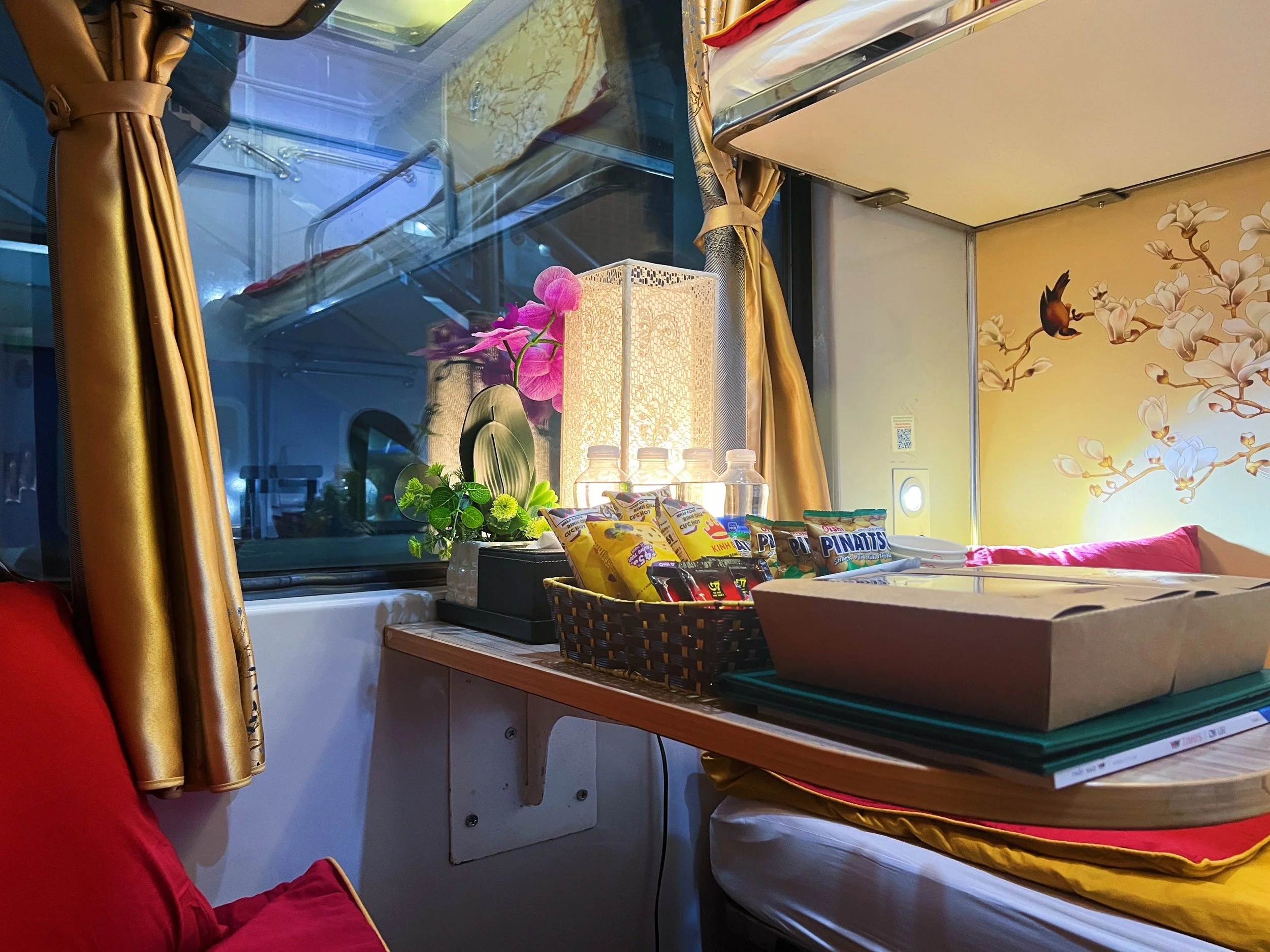 Noisy Russians aside, I’m quite charmed by my little train car with its four bunks, little table full of snacks, and personal chargers and reading lights over each of the gold-and-red-blanketed beds. And the views—now I see only darkness out my window, but on the way out of Hanoi, I rode alongside buses and scooters past a tree-lined lake and rows of blinking storefronts. Tonight, I’ve decided, I’ll leave the curtains open so that tomorrow, I’ll be greeted by the sunrise.