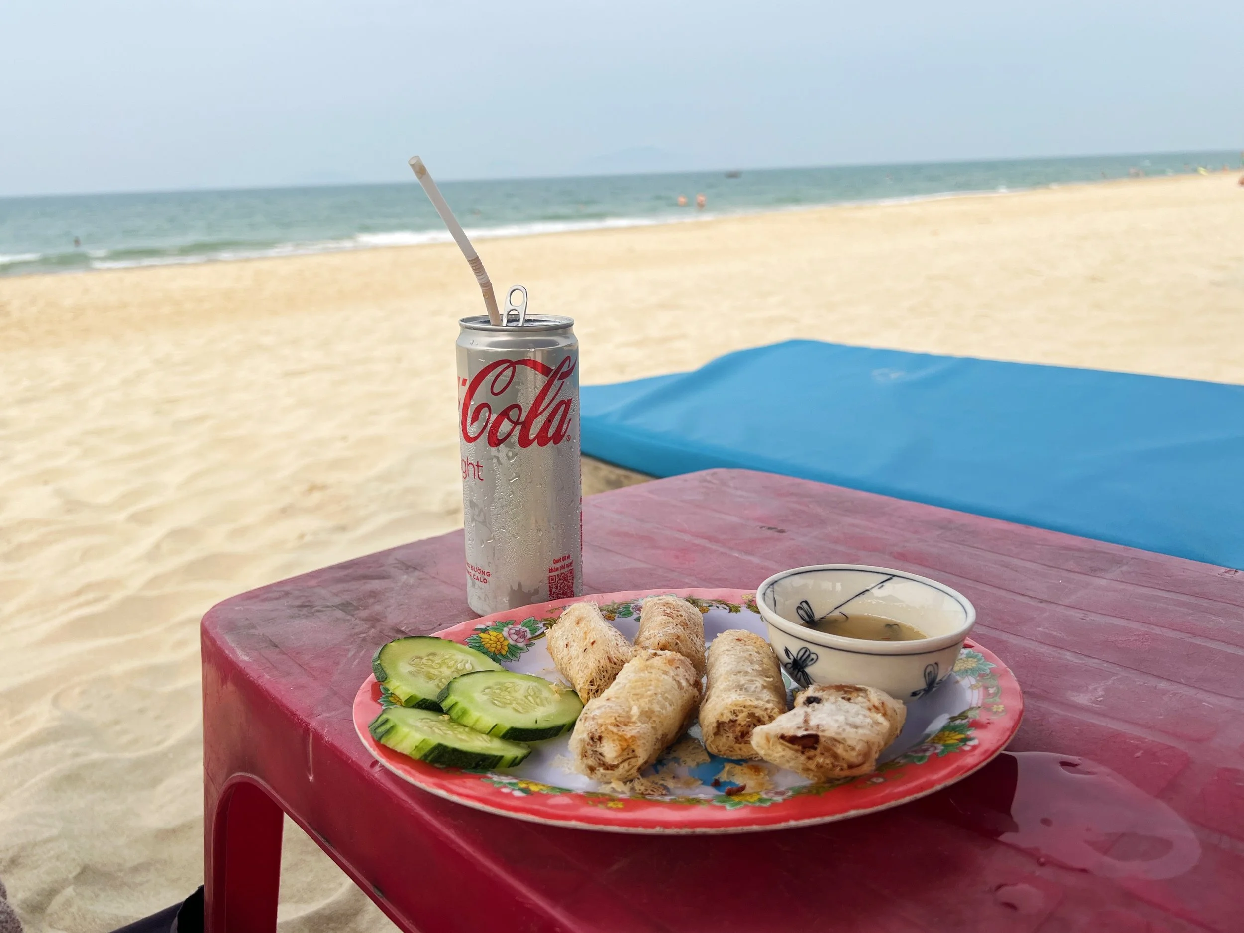 The reviews call An Bang Beach “crowded,” but it must be off-season, or their standards for beaches are too high, because it was quite calm all afternoon. Populated, but not too. Empty beach lounges were plentiful. To claim one for an entire day, you have but to purchase a single drink. Which reminds me—important update! We are officially in Coca Light territory.